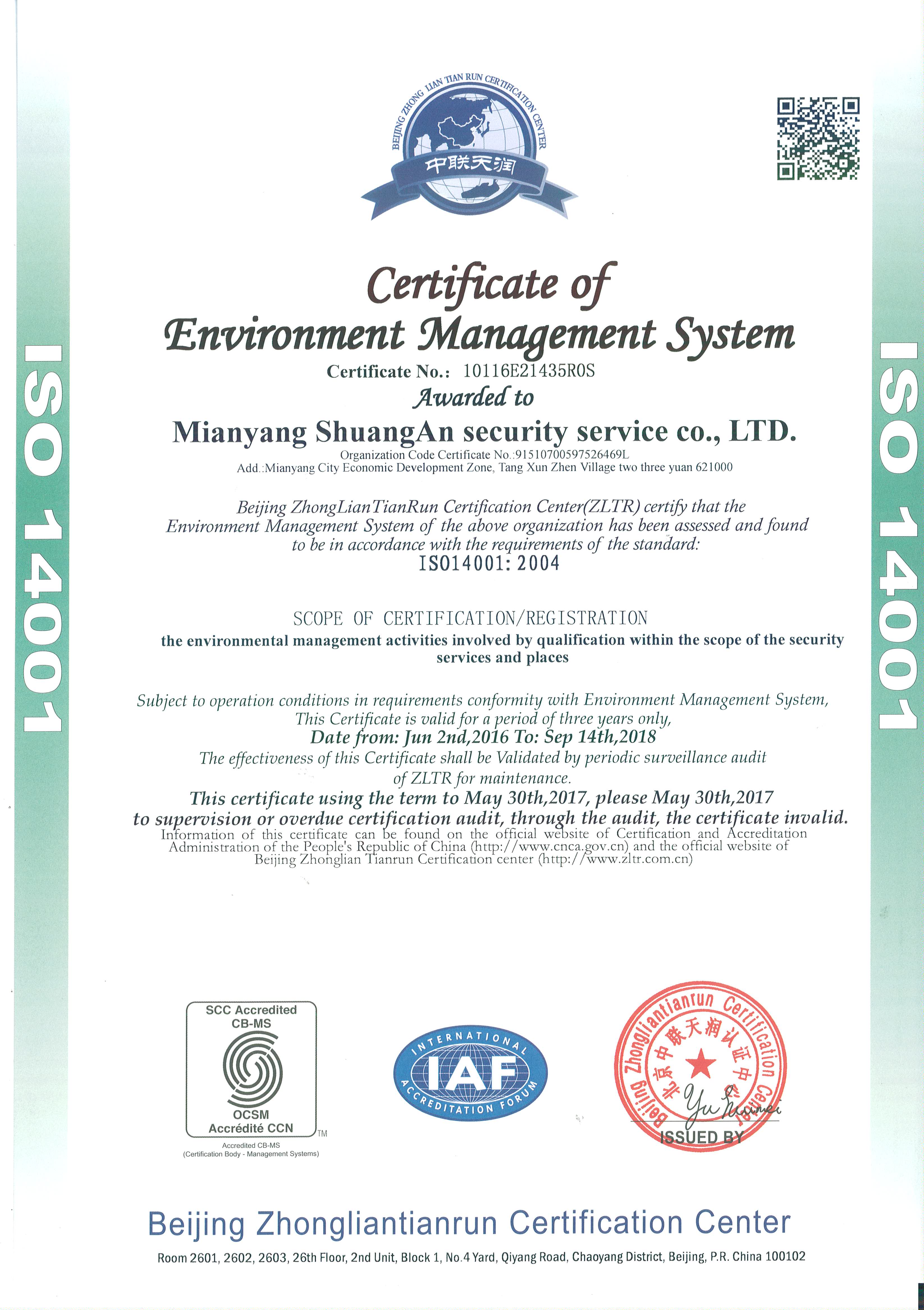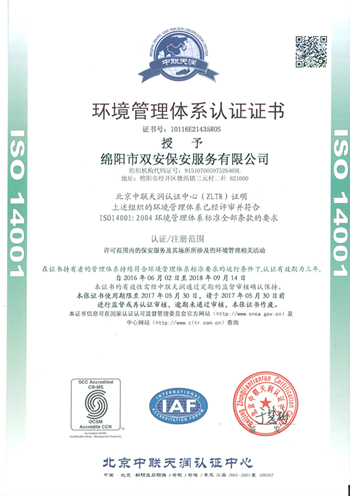 環(huán)境管理體系認(rèn)證證書